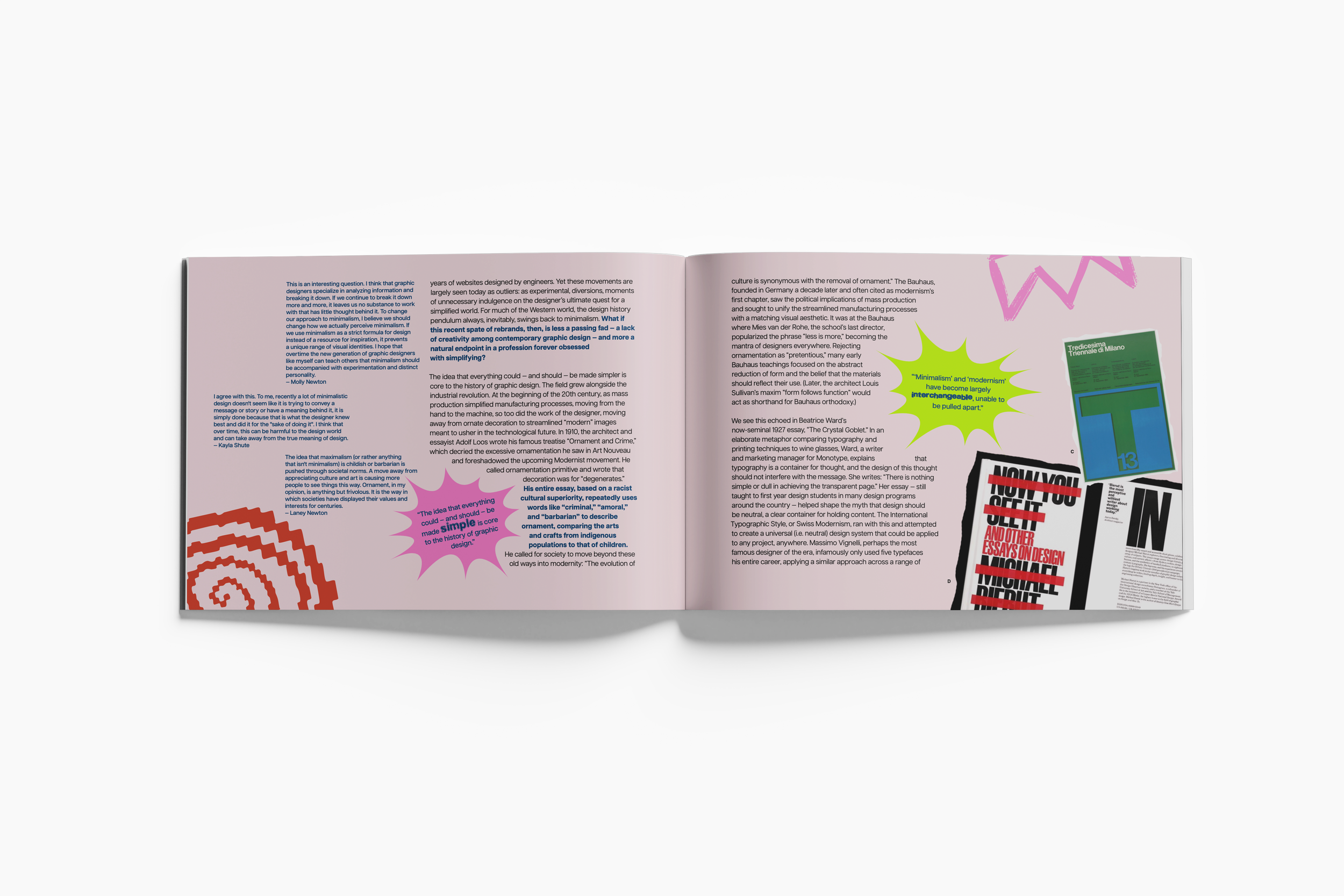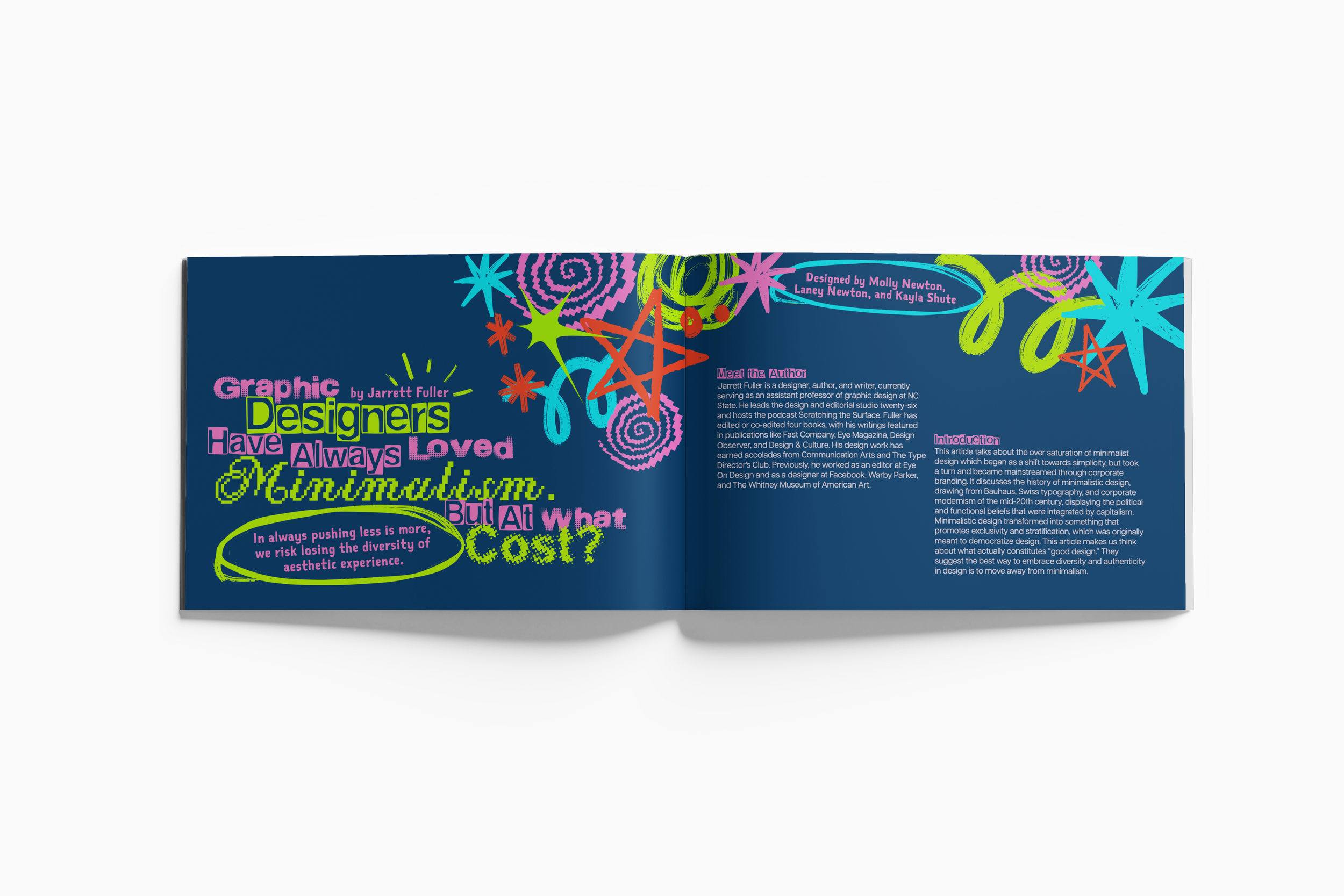 Reflection of Practice examines a series of articles that explore various topics related to design and its purpose. In collaboration with fellow designers, each of us responded to key ideas within the readings that we found personally meaningful or worthy of reflection. Additionally, we conducted an interview with a designer about a specific project, discussing their creative process, methods, and sources of inspiration. The project placed strong emphasis on typesetting and layout design to effectively communicate the themes of the articles while visually highlighting our individual commentaries.
